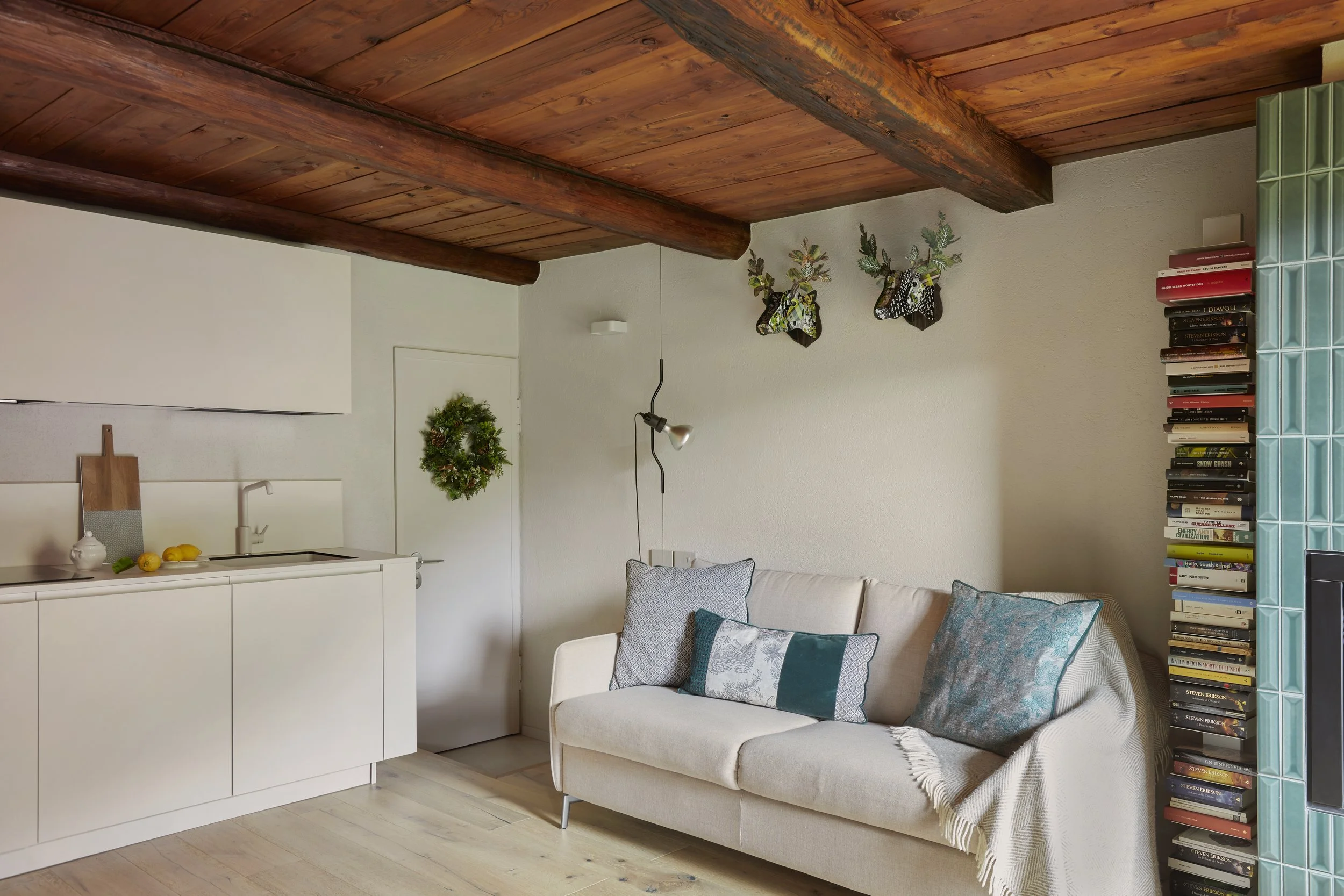 Il colore predominante uniforma pareti e serramenti interni con accenti di colore verde la cui scelta cromatica è nata dalla volontà dell'uso di questo colore in diverse declinazioni con richiami costanti alla montagna, dal rivestimento del camino alla cuscineria decorativa sartoriale.
